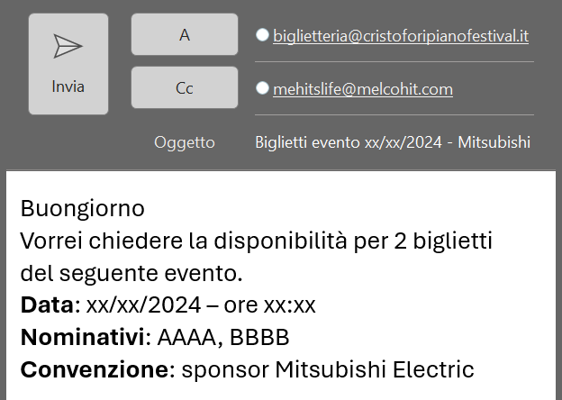 Free places reserved for MEHITS employees are limited. You can check availability by writing directly to biglietteria@cristoforipianofestival.it (with in copy mehits.life@melcohit.com) specifying the desired concert, the name and surname of the guests (maximum 2 per request, including the employee) and the name of our company. It will be the responsibility of the box office itself to communicate when the available seats have been filled.